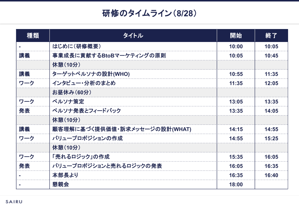 研修のゴールは、業務で実際に活用できるペルソナ、バリュープロポジション、カスタマージャーニーマップをアウトプットすることです。研修でつくったものを、翌日から実務で使える状態にすることをめざしました。