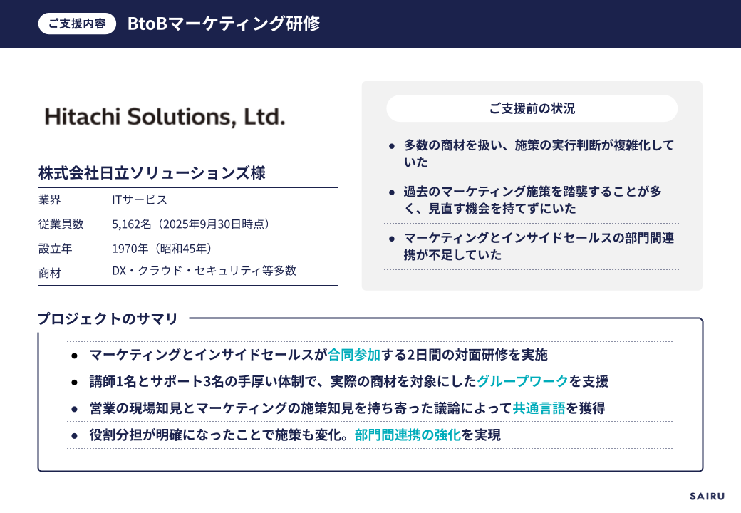 そんな同社では、商材ごとにターゲットや提供価値が異なるため施策の実行判断が複雑化。マーケティングとインサイドセールスがお客さまへの共通の理解を持たずに活動していたことで、効果的な連携ができていませんでした。その状況を変えるべく、才流(サイル)に研修をご依頼いただきました。