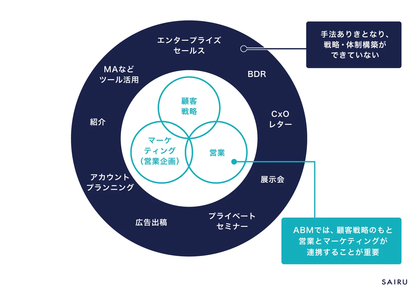 ※ABM(Account Based Marketing):ターゲットアカウント(企業)を個社の単位まで定め、アカウントからのLTV最大化を目指すときに最適な戦略。既存顧客・新規顧客を問わず、営業とマーケティングを中心とした各部門連携のもとで、ターゲットアカウントごとにカスタマイズされた、マーケティングおよび営業活動を行う