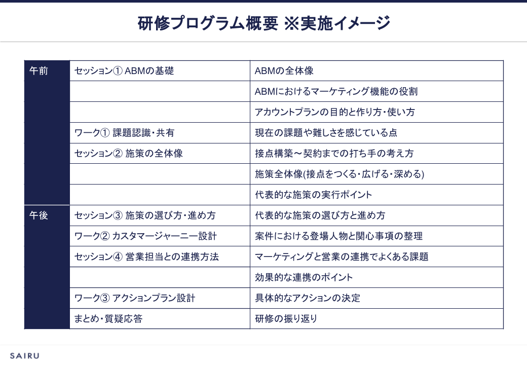 政次 先ほどのお話にあったように、JTB様からは「この研修が終わった後、具体的なアクションに移れるようにしたい」というご要望をいただいていました。そこで今回のABM研修は、理論よりも実践を重視した構成にしています。実践の内容もターゲット設定やプランニングは最小限にとどめ、具体的な施策やアクションにフォーカスしました。
