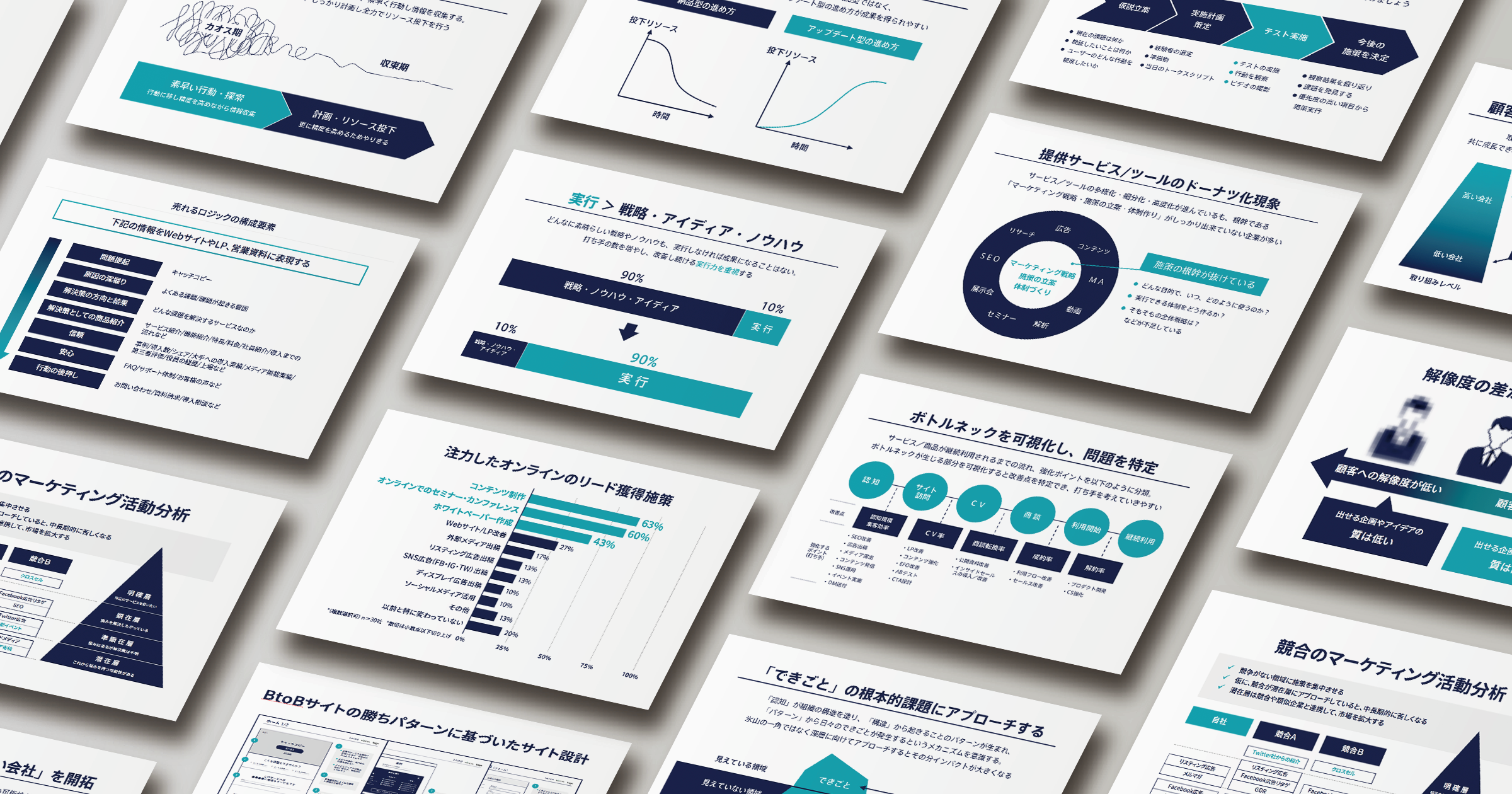 課題に応じてマーケティングのメッセージやチャネル選定の見直し、営業資料の改善提案などを行います。