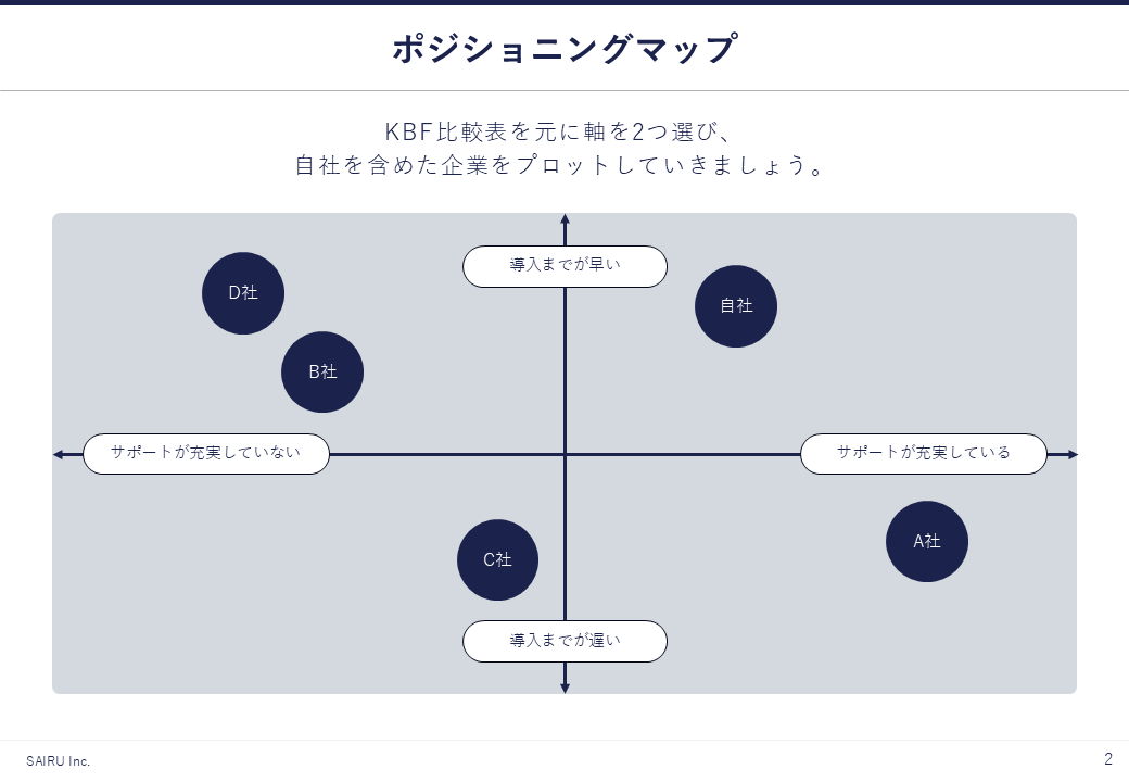 作成ステップの詳細は、「ポジショニングマップの作り方~肝となる軸の決め方をテンプレート付きで解説~」の記事で解説しています。