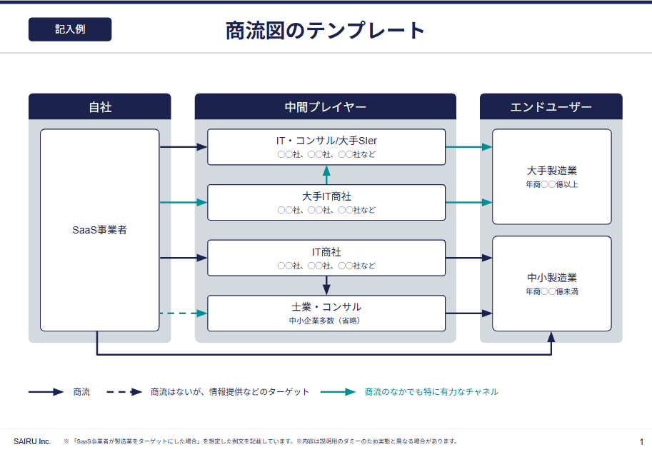 商流図とは、商品・サービスがメーカーから顧客へ届くまでの流れを可視化した図解です。商流図を描くことで、業界構造、主要プレイヤー、情報の流れをひと目で把握でき、自社と親和性の高いパートナーを見極めやすくなります。