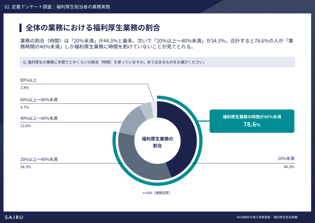全体の業務における福利厚生業務の割合は「20%未満」と回答した人が最も多く、次いで「20%~40%未満」となりました。合計すると、「福利厚生業務にあてる時間が全体の40%未満」の人は78.6%にのぼります。