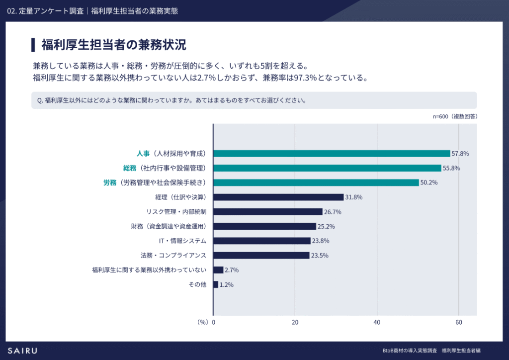 福利厚生担当者の兼務率は全体の97.3%。人事・総務・労務との兼務が50%超え