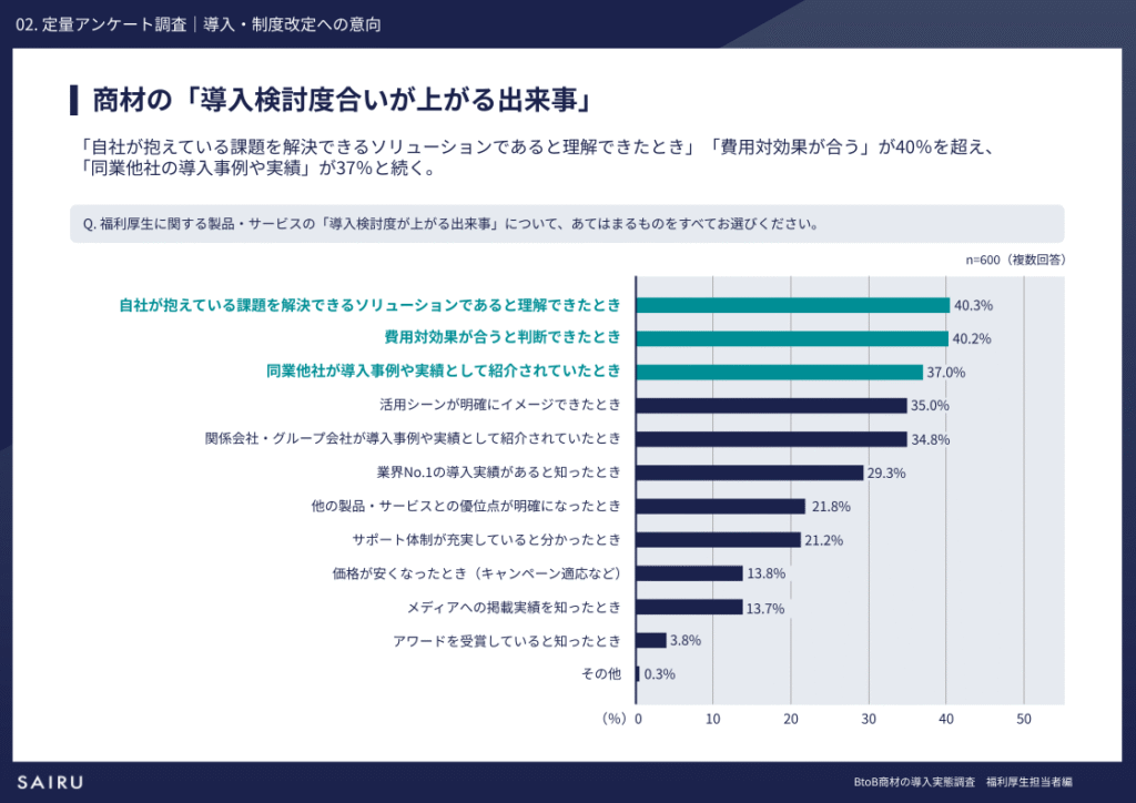 最後に、商材の「導入検討度合いが上がる出来事」について聞いたところ、「自社が抱えている課題を解決できるソリューションであると理解できたとき」(40.3%)、「費用対効果が合うと判断できたとき」(40.2%)、「同業他社が導入事例や実績として紹介されていたとき」(37.0%)が上位となりました。