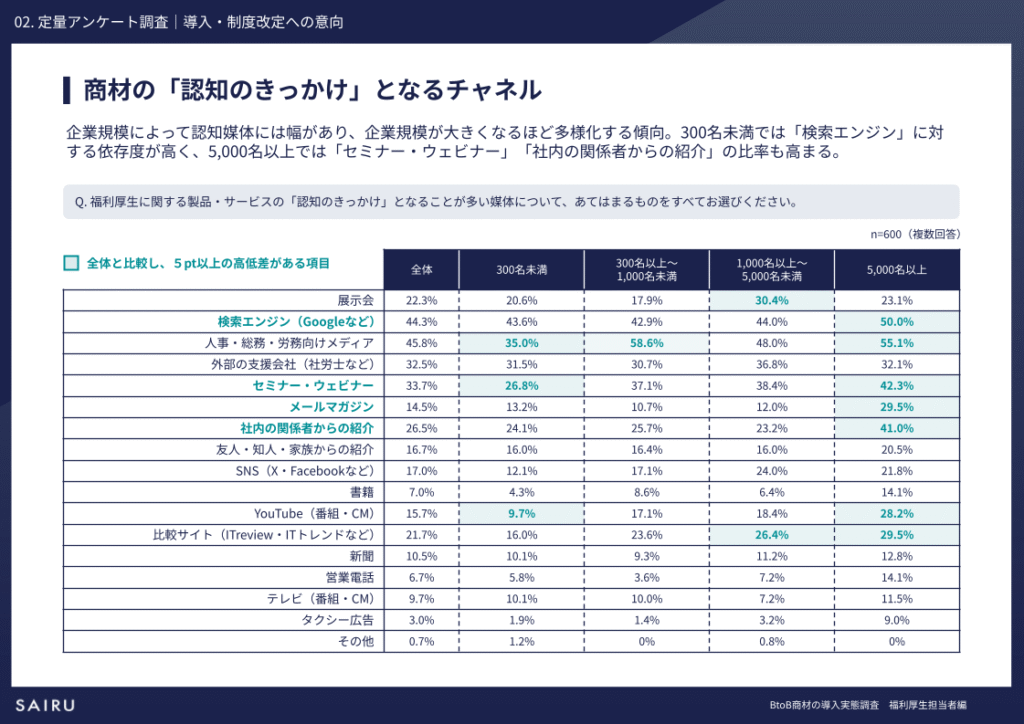 全体では人事・総務・労務向けメディア(45.8%)、検索エンジン(44.3%)、セミナー・ウェビナー(33.7%)の順番に多くなっています。しかし、企業規模別にみると、認知チャネルには幅があることがわかります。