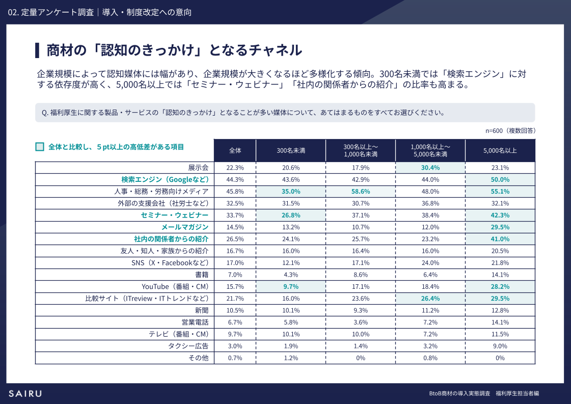 検索エンジン対策や人事・総務・労務向けメディアでの露出を基本としながらも、自社のターゲットの企業規模に応じて、チャネルの幅を決定することを推奨します。