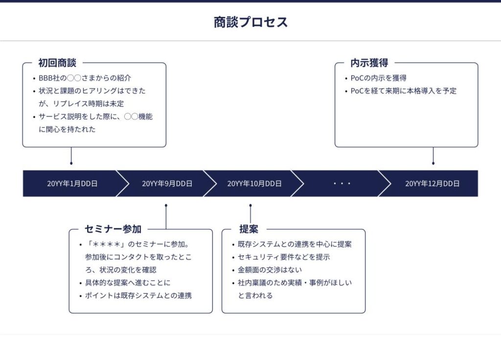 - 商談プロセス全体像(初回商談の年月日、きっかけ、契約までの流れ、顧客のニーズなど)接点(きっかけや内容、部署、役職、氏名、顧客のニーズ、提案内容など)
