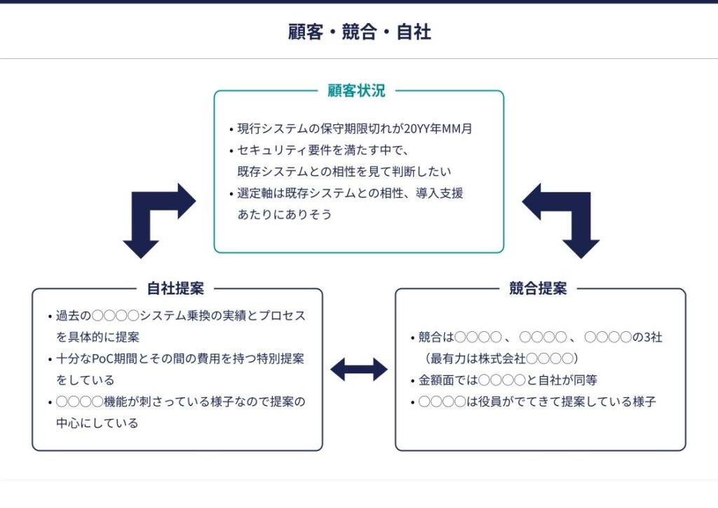 - 顧客(予算、決裁者、課題・ゴール、導入時期、社内体制など)
