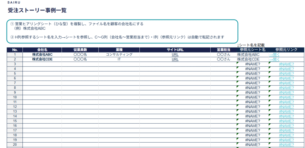 営業ヒアリングシートには、「事例一覧」「営業ヒアリングシート(ひな型)」の2シートが用意されています。