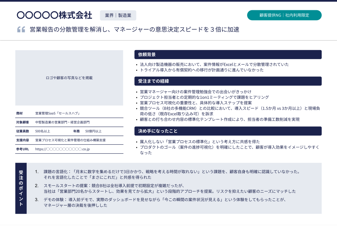 「受注ストーリー事例」とは、商品・サービスが顧客に売れた背景、営業の提案、決め手になったことなど、受注までの一連のストーリーをまとめた事例のことです。会社によっては、「商談事例」「社内用事例」などと呼んでいる方もいるかもしれません。