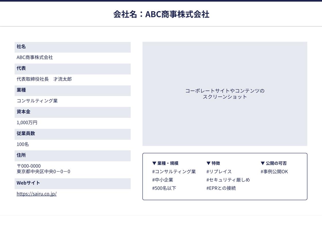 - 基本情報(社名、業種、従業員数、WebサイトURLなど)