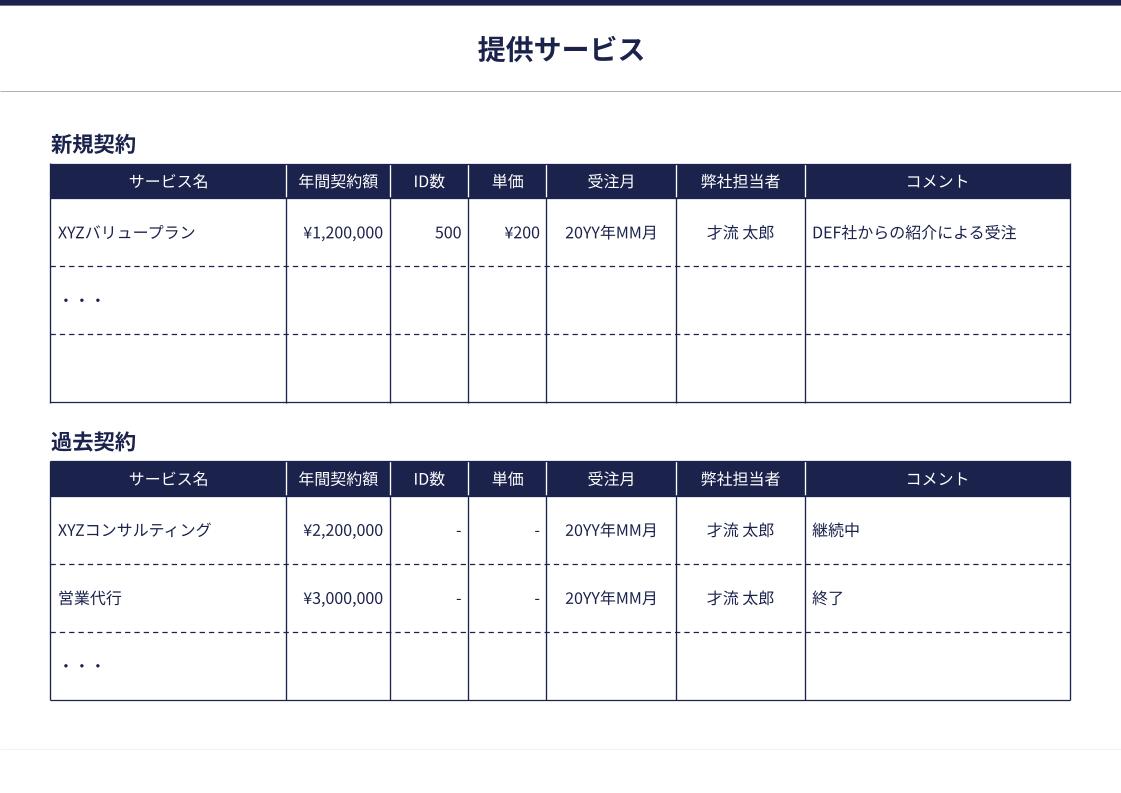 - 提供商品・サービス(年間契約額、金額、受注までの経緯など)
