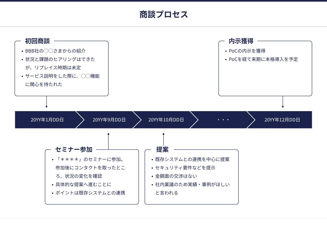 - 商談プロセス全体像(初回商談の年月日、きっかけ、契約までの流れ、顧客のニーズなど)接点(きっかけや内容、部署、役職、氏名、顧客のニーズ、提案内容など)