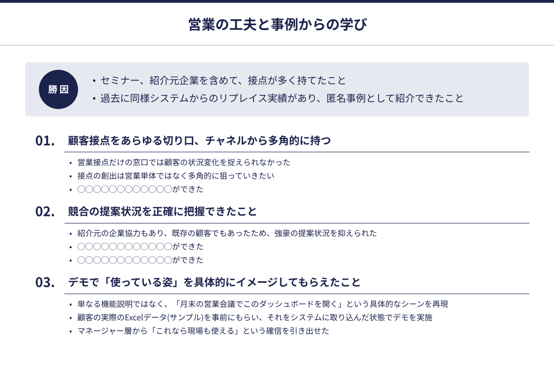 - どのような課題を持つ顧客に、どのような提案をして受注できたか