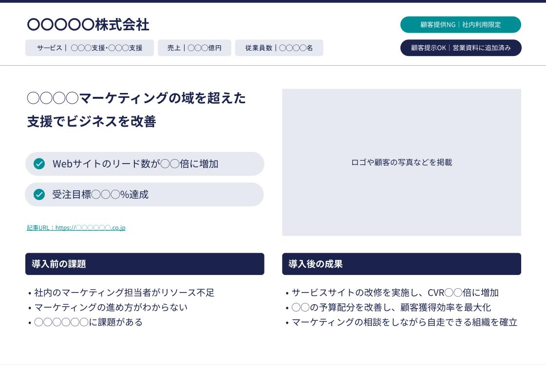 「各社作りやすいものでいい」と説明しましたが、あとから顧客の許諾がとれる可能性がある場合は、スライド形式がおすすめです。許諾が取れたあとに内容を少し調整するだけで、そのまま商談で使える資料になるからです。フォーマットを統一し、探したい事例がすぐに見つかるように「検索性・ストック性」を保つようにしておきましょう。