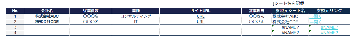 ④ 営業ヒアリングを実施し、内容をシートに記載します。事例一覧のシートの【参照元シート名】欄を入力すると、他の項目は自動で転記されます。