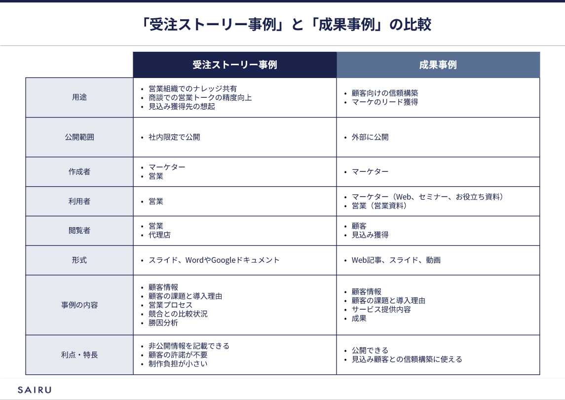 一方、受注ストーリー事例は導入後の成果は必須ではなく、公開範囲は社内限定です。顧客の許諾は必要なく、マーケターが営業担当者にヒアリングするだけで作れるという利点もあります。