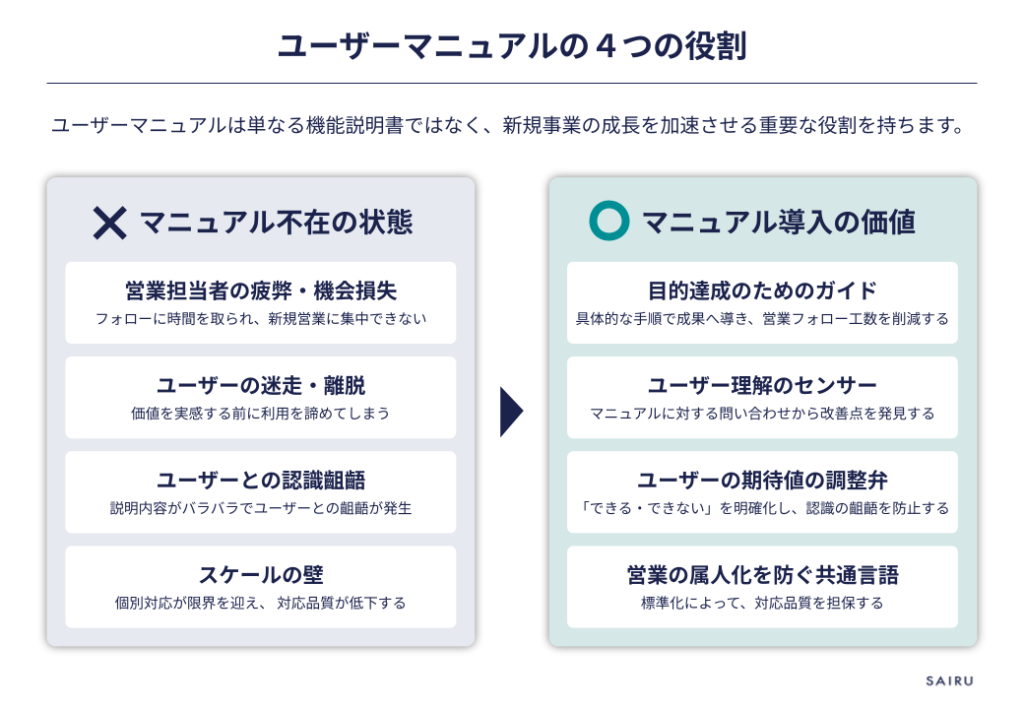 ここで言うユーザーマニュアルは、機能を網羅した「辞書」的なものではなく、新規事業を成長させるための「戦略的なツール」と位置づけます。