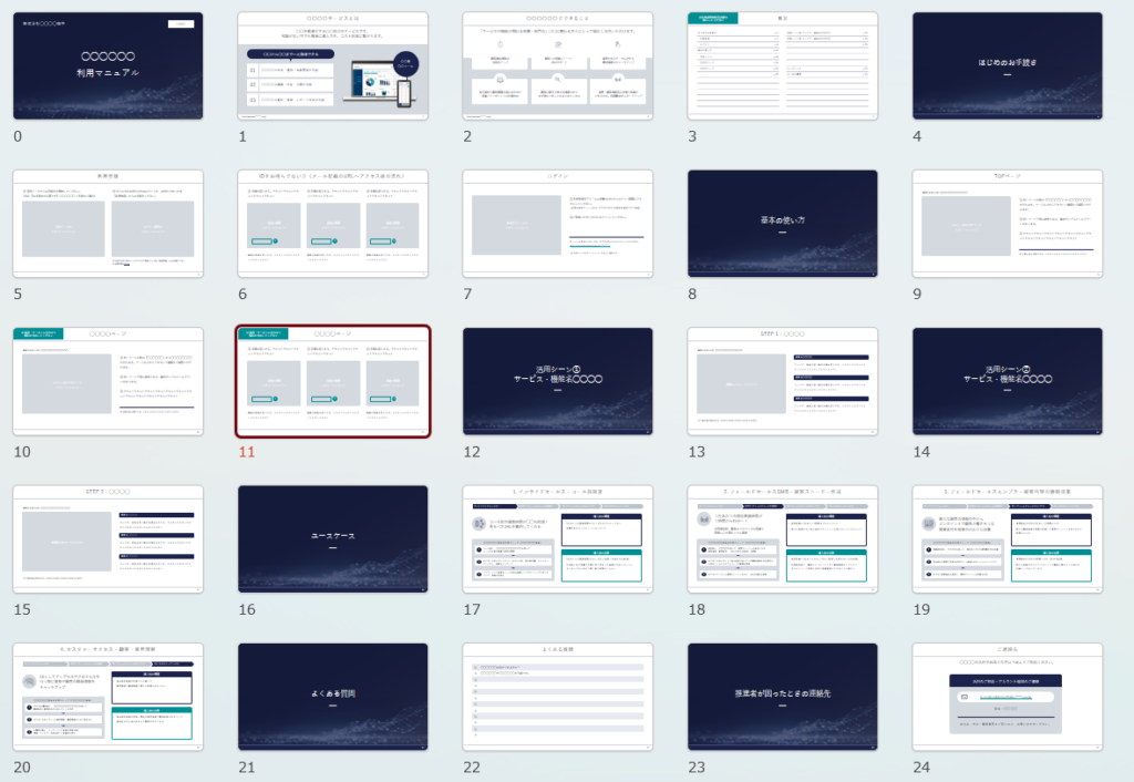 ■ ユーザーマニュアルテンプレート(ショートバージョン/13ページ/Powerpoint形式)■ ユーザーマニュアルテンプレート(フルバージョン/24ページ/Powerpoint形式)※個人情報の入力は必要ありません。クリックするとダウンロードされます。