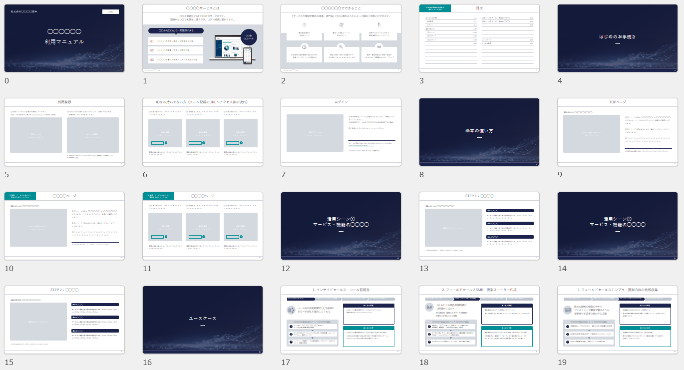 ■ ユーザーマニュアルテンプレート(ショートバージョン/13ページ/Powerpoint形式)■ ユーザーマニュアルテンプレート(フルバージョン/24ページ/Powerpoint形式)※個人情報の入力は必要ありません。クリックするとダウンロードされます。