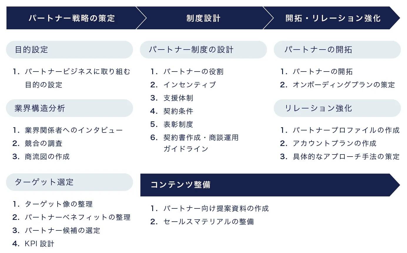 約220社の支援実績にもとづいたパートナーマーケティングや法人営業のメソッドをもとに、パートナービジネスの戦略設計・実装から伴走支援まで行います。