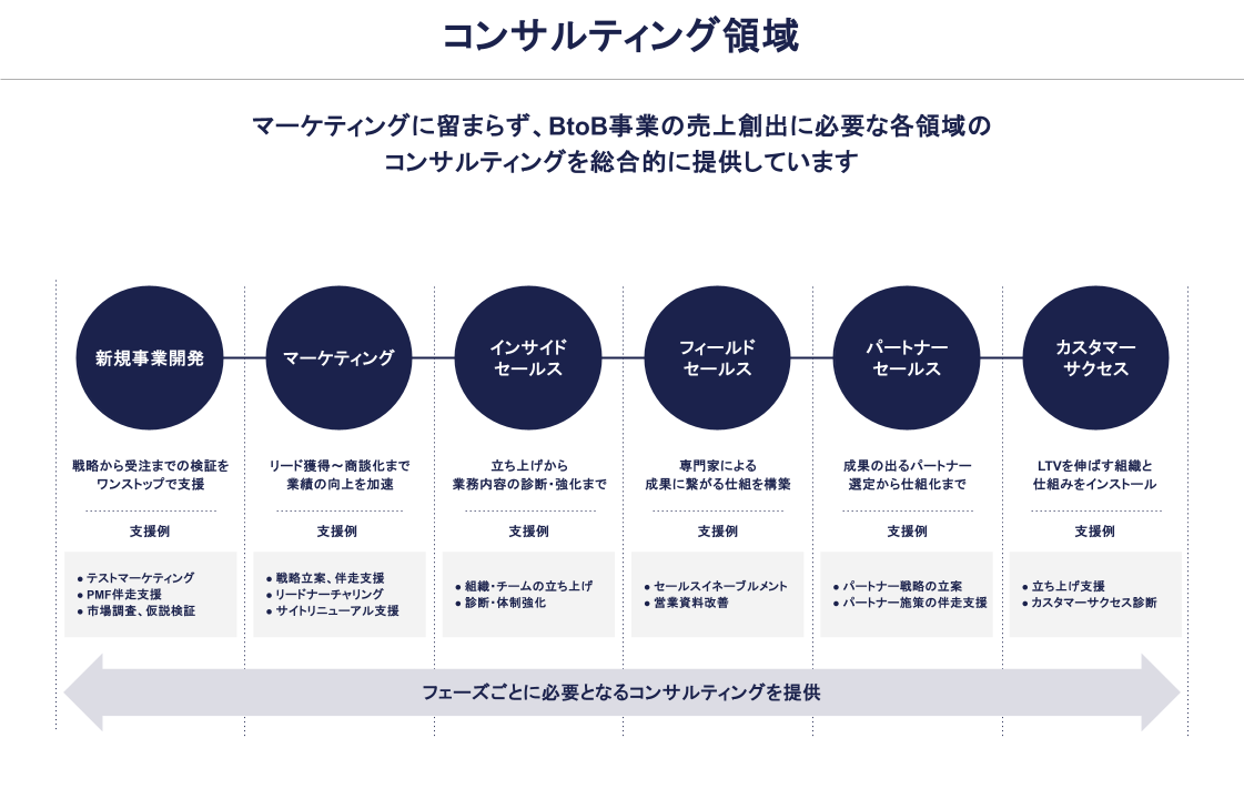 なぜなら、新規事業開発、マーケティング、インサイドセールス、カスタマーサクセスまで、BtoBに特化し各プロセスを一気通貫で支援できる点が強みと自負しているからです。