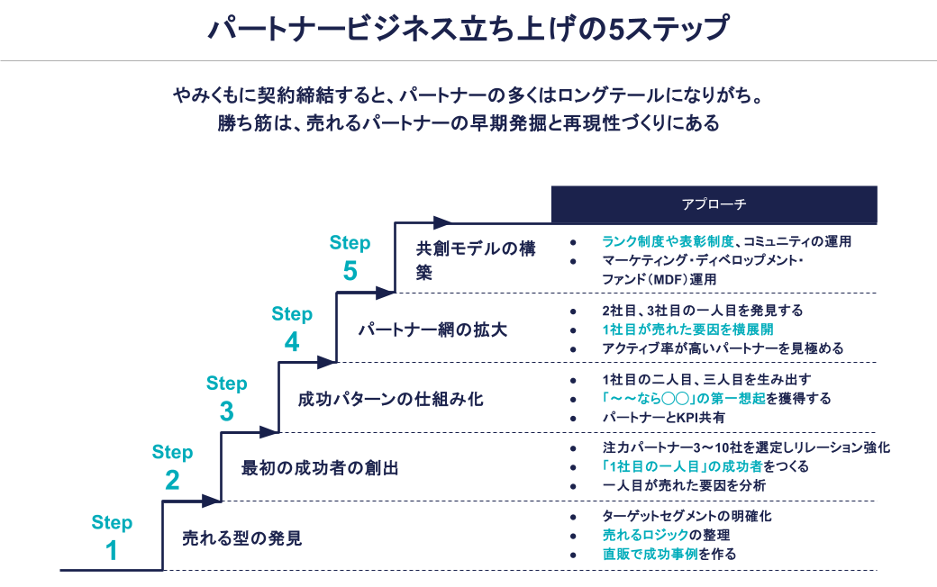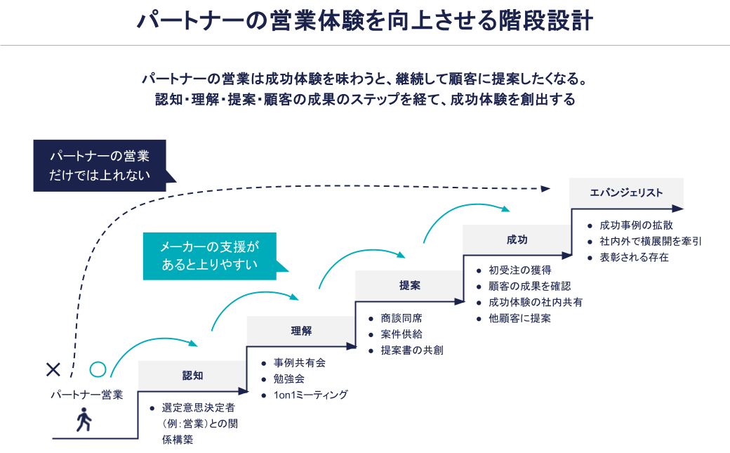 次に、注力パートナーと「売れる一人目」の成功体験を創出し、その成功要因を誰でも再現可能な「型」へと転換。パートナーの営業体験全体をデザインすることで、貴社に属人性を排した「売れる仕組み」を構築します。