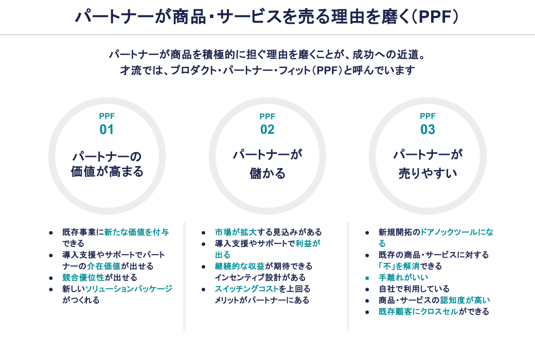 やみくもにパートナー契約を増やすのではなく、まずはパートナーが「自ら売りたい」と感じられる理由を設計するために、「PPFプロダクト・パートナー・フィット)」を明確に定義します。