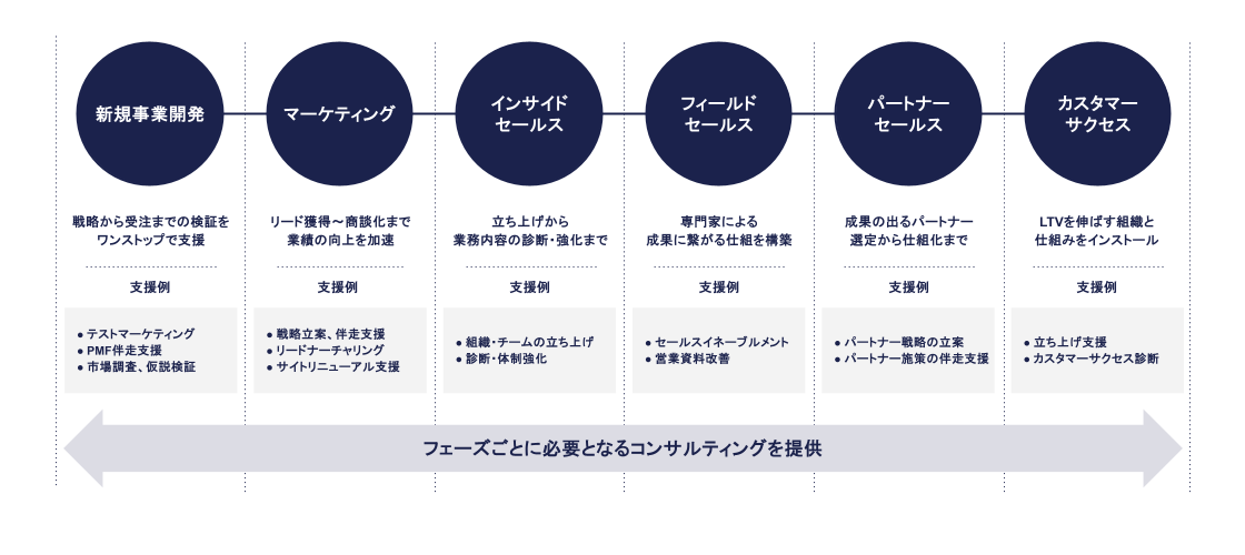 新規事業は総合格闘技と言われています。一気通貫でサポートするからこそ、問題の根本がプロダクトなのか、マーケティング手法なのか、商談スキルなのかを的確に判断し、適切な処方箋を提供します。