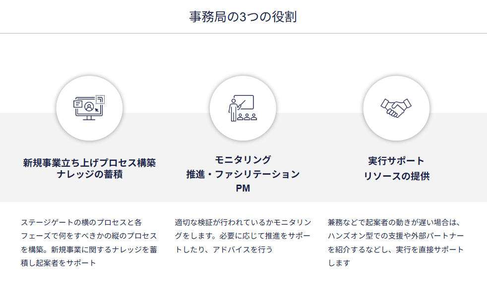 新規事業事務局は、事業の成功確度を高めるために、以下の3つの役割を果たします。