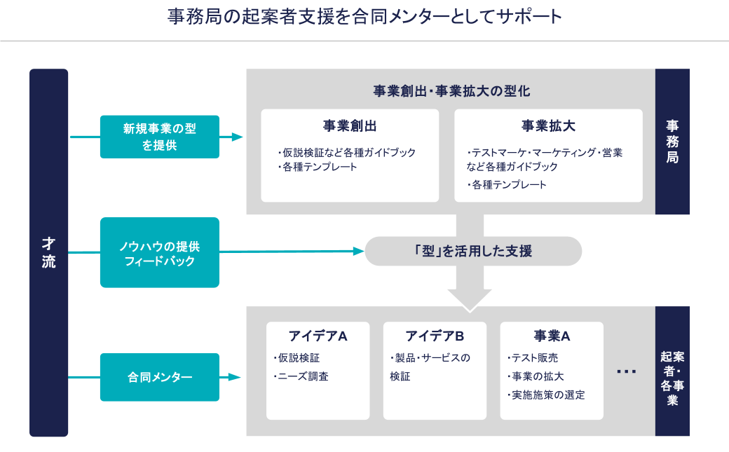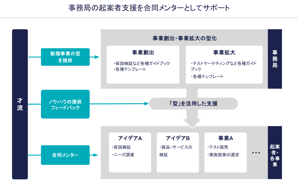 才流が体系化した新規事業開発の「型」を事務局に提供。新規事業開発の「型」を活用し、事務局と才流の「合同メンター」として起案者のアイディエーションから事業の仮説検証までを伴走支援します。