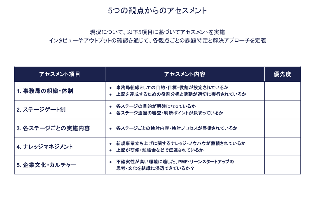 貴社の新規事業開発プログラムを定期的に5つの観点でアセスメント。作って終わりの新規事業開発プロセスではなく、継続的なアップデートを支援しつづけます。