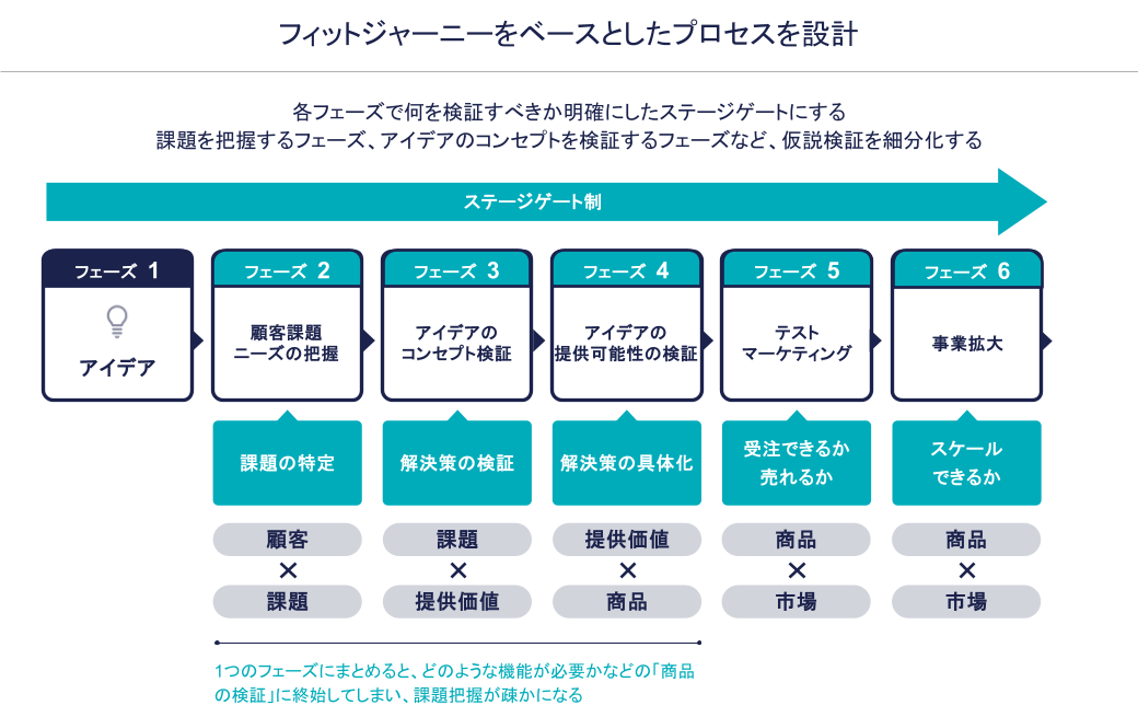 フィットジャーニーをベースに、各フェーズの検証項目や評価基準を明確にしたステージゲート制のプロセスを設計します。