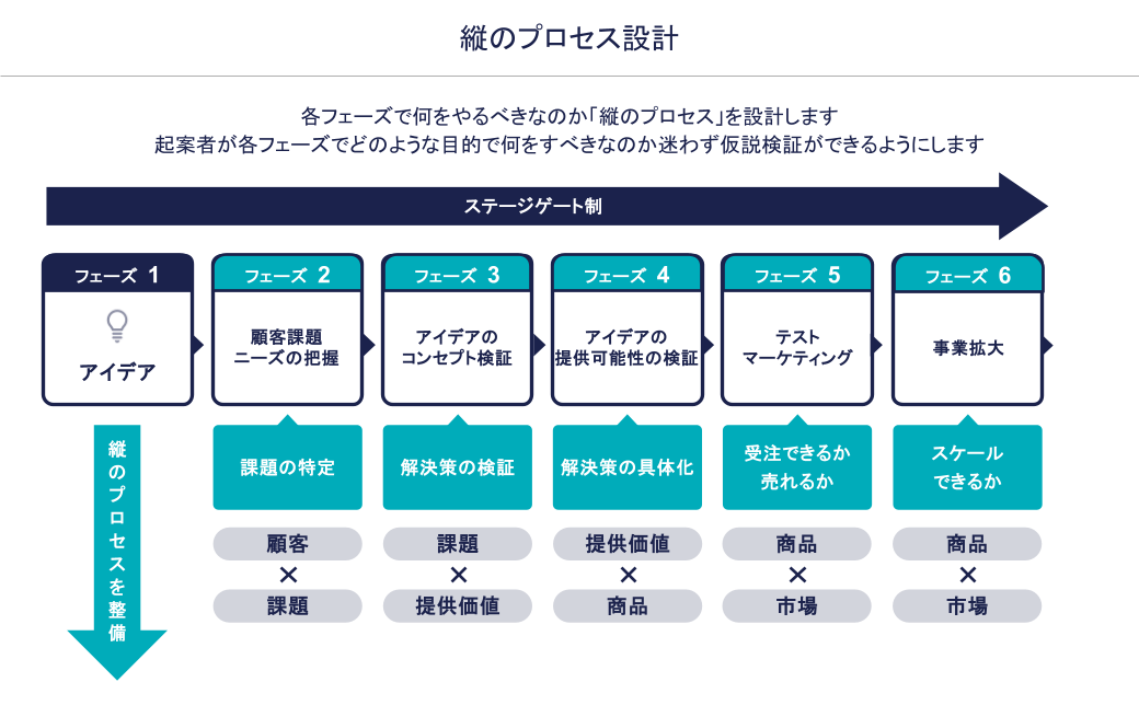 起案者が各フェーズでどのような目的で何をすべきなのか迷わず仮説検証ができるよう、各フェーズにおけるプロセスや達成すべき内容を整理します。