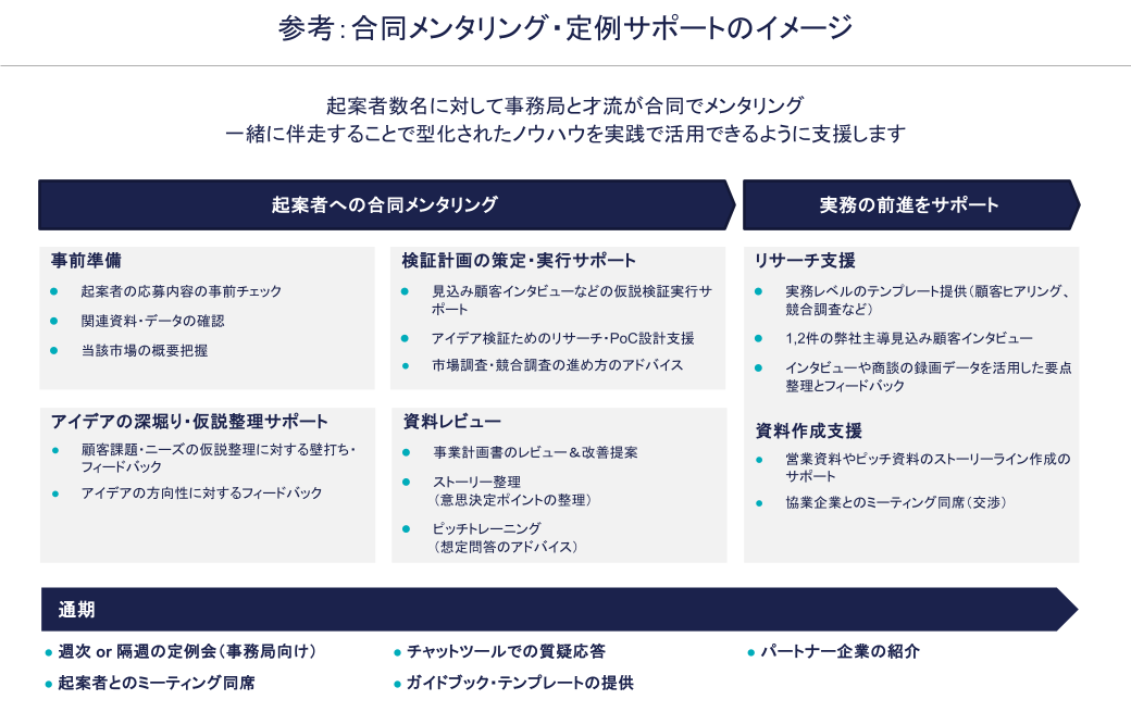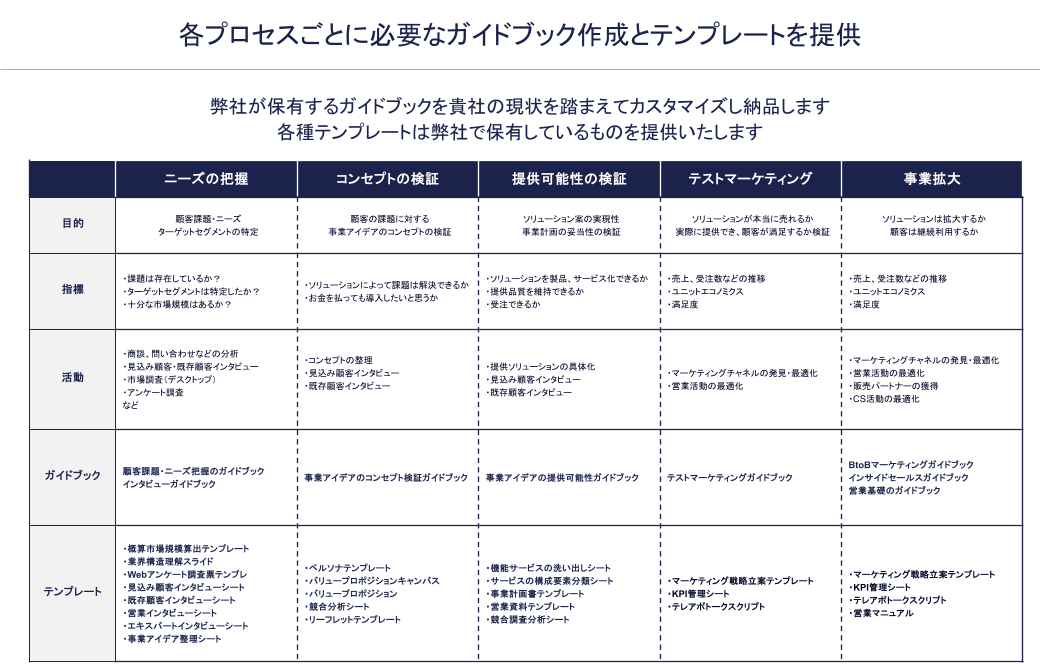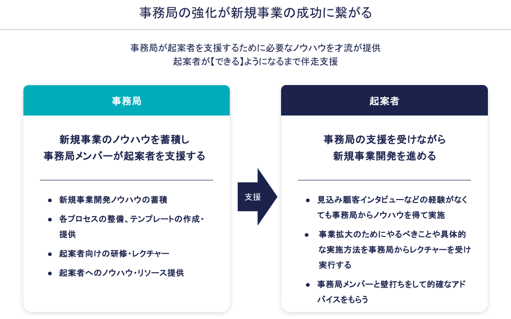 新規事業事務局が担当者・事業責任者を適切に支援できるための「型」を提供し、定着まで伴走します 。