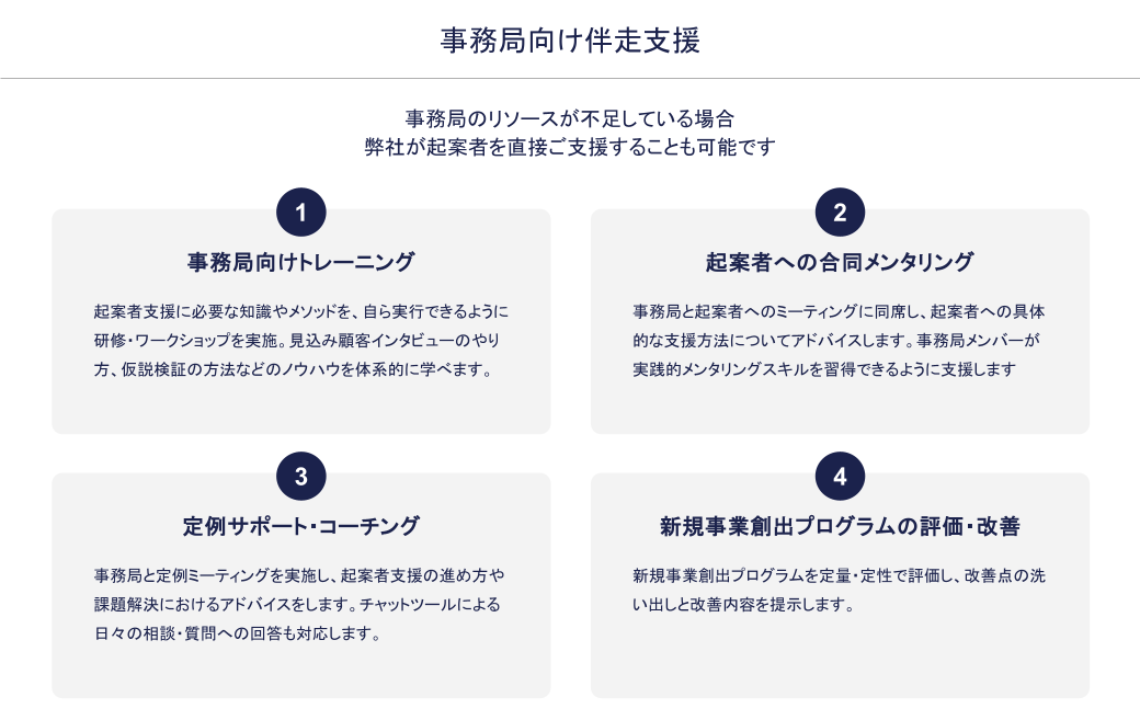 事務局に対する支援だけでなく、起案者へのサポートから制度に対するアセスメントまで、新規事業開発の仕組みづくりを一気通貫でサポートします。