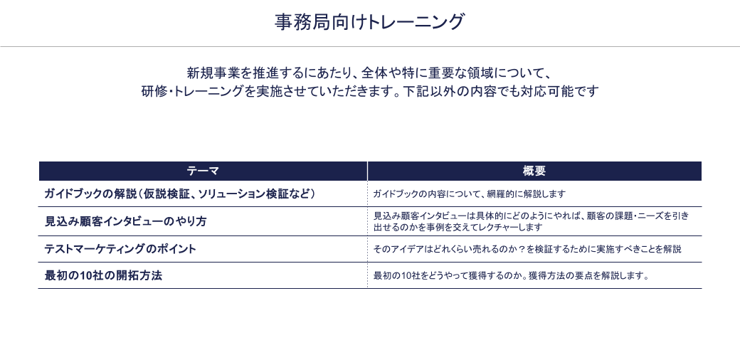 貴社向けに作成した事業開発ガイドブックの解説や、見込み顧客インタビューのような手法論やTipsまで細かく解説します。